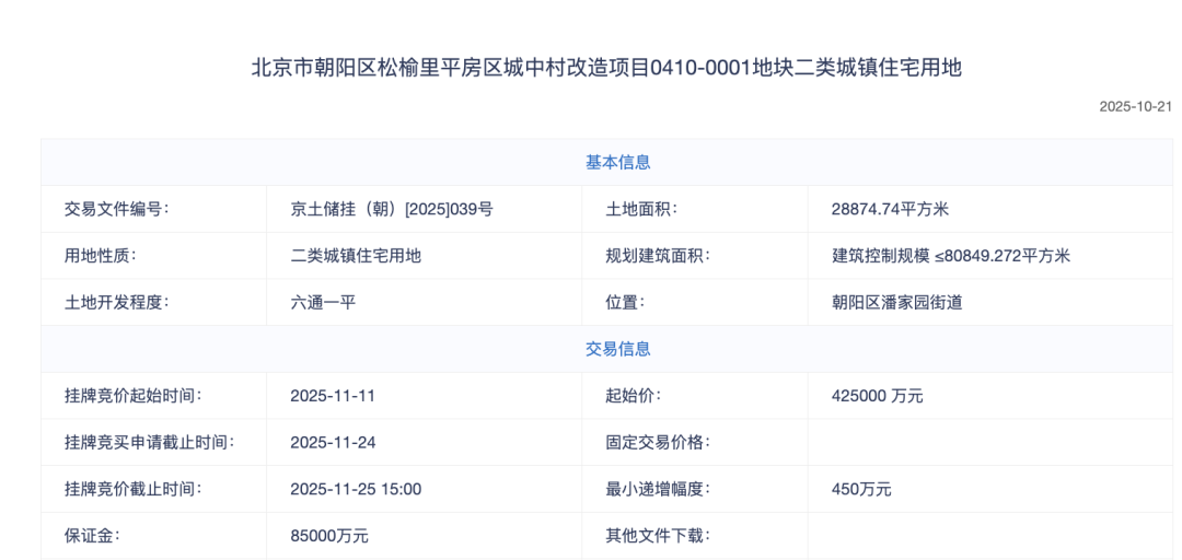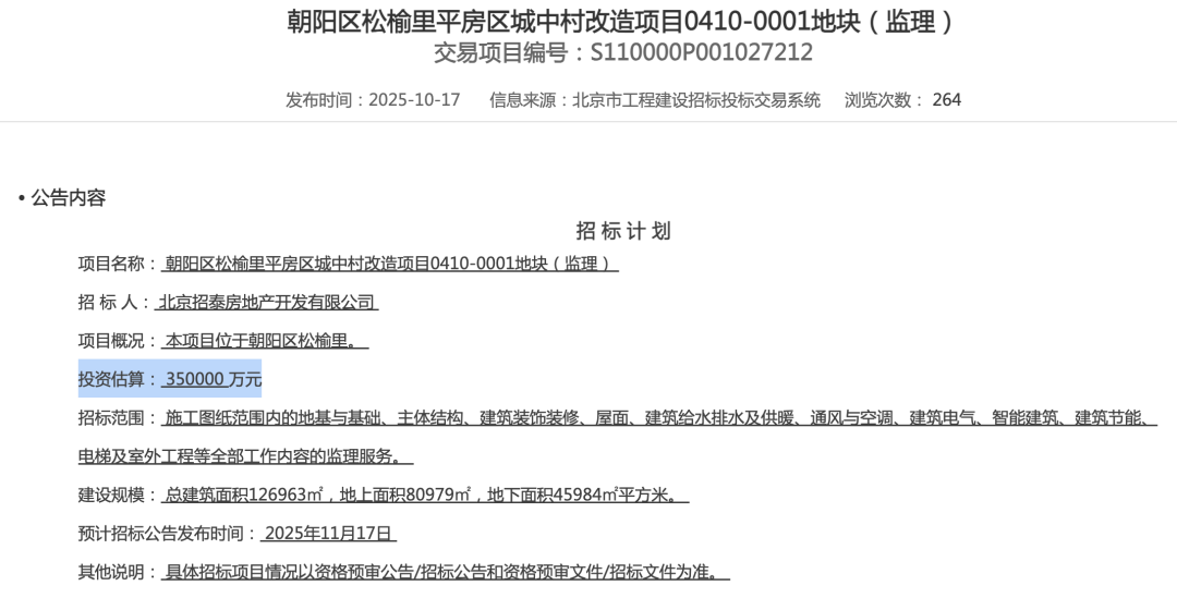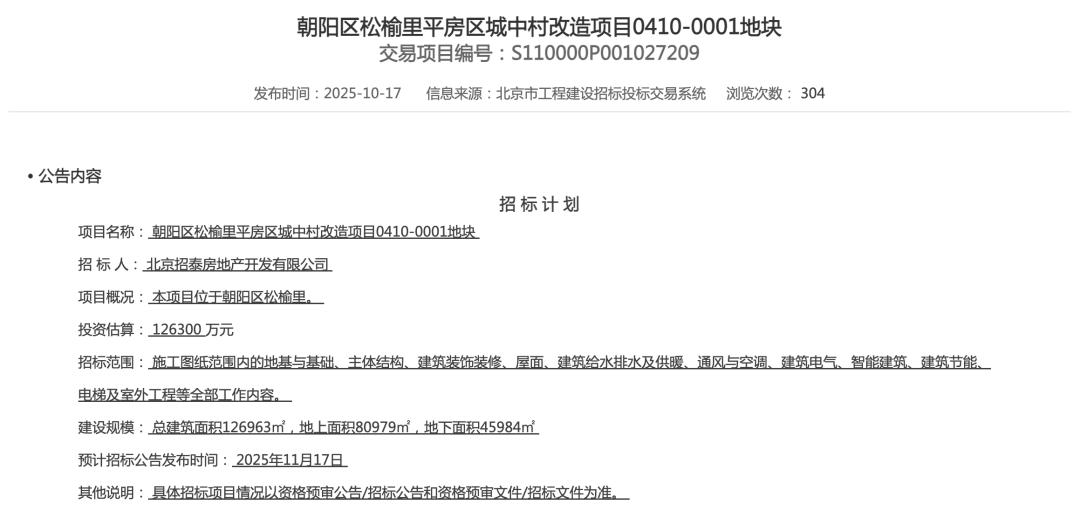 10月17日,北京市公共资源交易服务平台公告了两则关于朝阳区松榆里0410-0001地块的招标计划,分别为施工和监理。