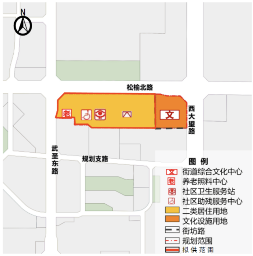紧邻居住用地东侧出入口建议设置小区公共建筑与公共空间,作为连接小区与规划文化用地、地铁站点的重要节点。