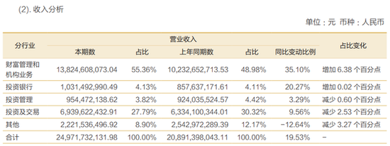 年报显示,从收入分析看,财富管理和机构业务成为公司最大增长引擎,全年实现收入138.25亿元,同比增长35.10%,占总营收比例提升至55.36%;投资银行业务收入10.31亿元,同比增长20.27%;投资管理业务收入9.54亿元,同比增长3.29%;投资及交易业务收入69.40亿元,同比增长9.56%。