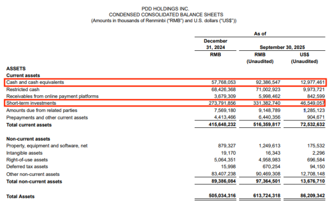 拼多多日前发布的财报中披露,截至 2025 年 9 月 30 日,其现金及现金等价物、短期投资合计已达到约 4238 亿元,相比去年年底增加了 922 亿元。