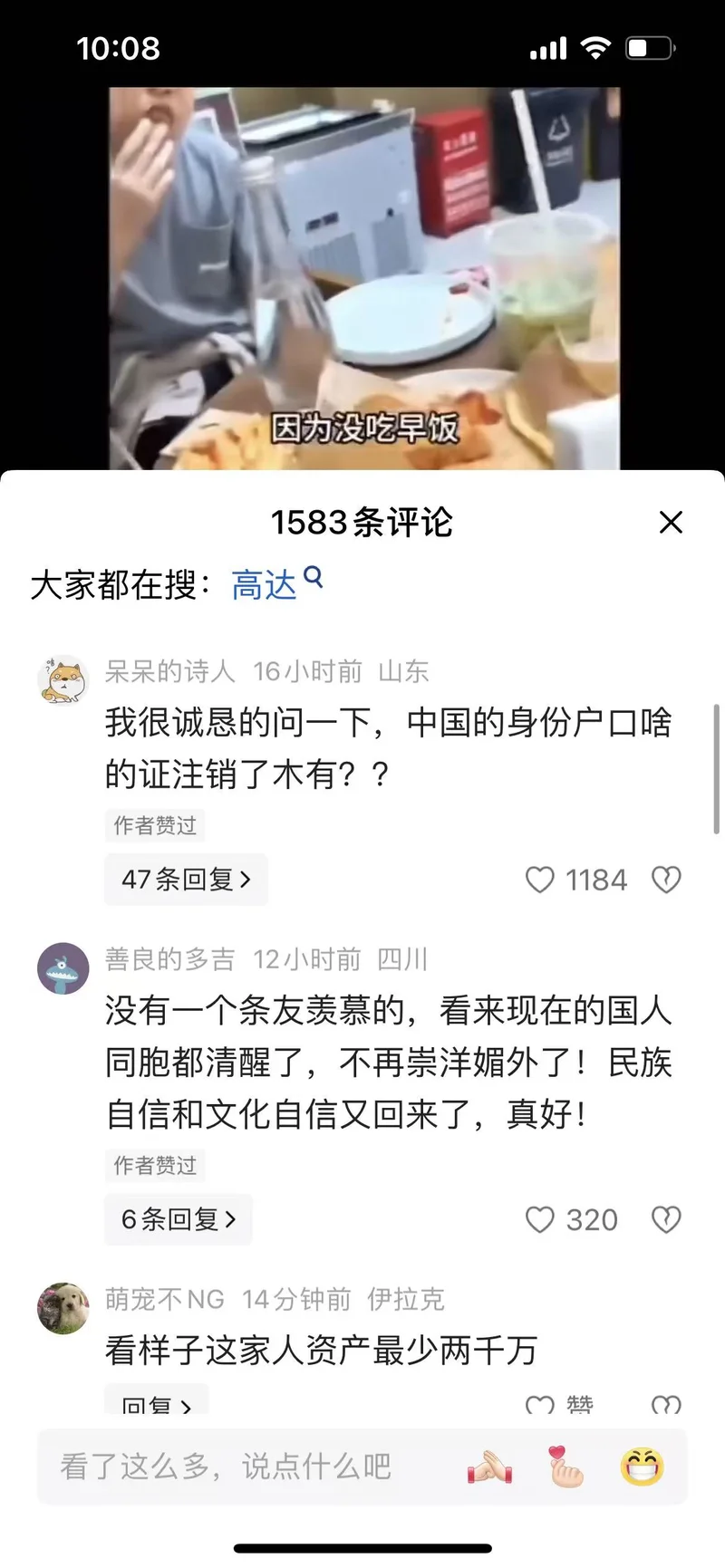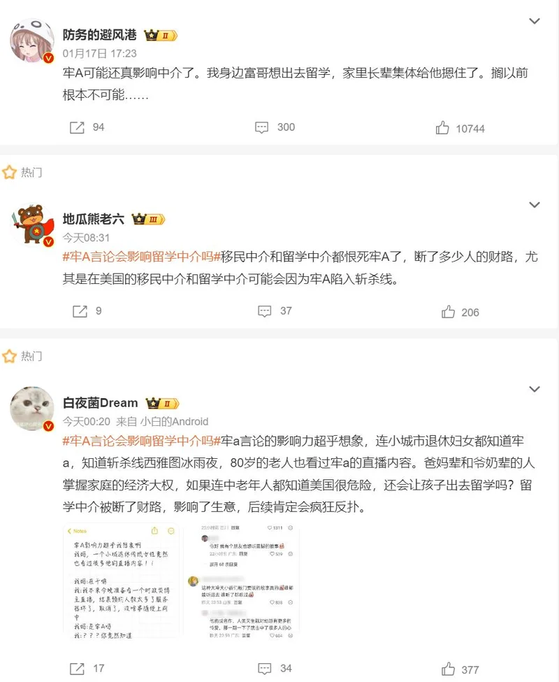 有网友担心,牢A回国并不代表真正安全,这些被断掉财路的人,可能会采取以下手段——或等待有人曝光牢A真实信息,或从其小学开始挖出黑料,进行污名化。或从牢A直播中找出某些瑕疵,断章取义进行攻击。或在日常生活中,像娱乐圈的狗仔偷拍偷录,进行道德绑架,搞垮人设。