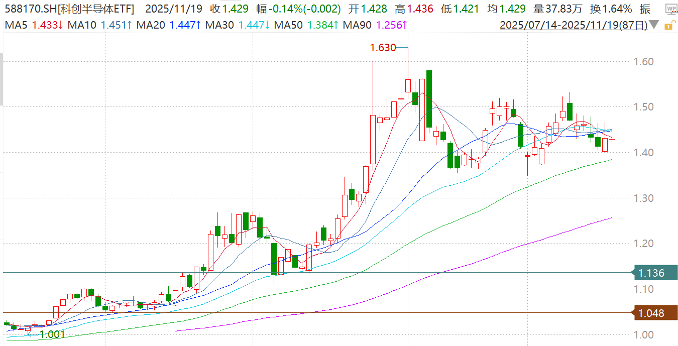 2025年11月19日,沪指飘红,盘面锂矿继续活跃,昨日领涨的半导体板块,今日蓄势回调,上证科创板半导体材料设备主题指数轻微下跌。科创半导体ETF(588170)整固蓄势,但50日、90日均线依旧呈现多头排列,中期趋势稳固,回调或为加仓机遇。