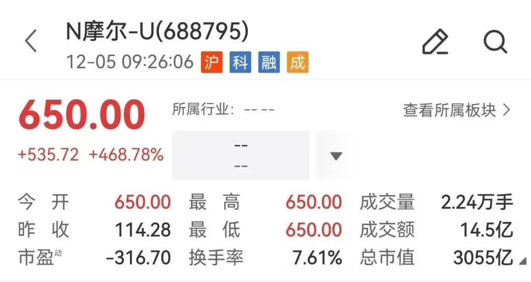 被誉为“国产GPU第一股”的摩尔线程正式登陆科创板,首日高开表现亮眼,市值达3055亿元,成为科创板第4大芯片股,报650元/股,较114.28元/股的发行价上涨468.78%。