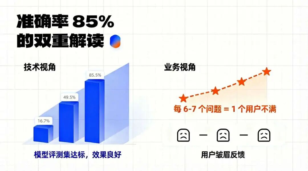 如果站在模型或系统层面,这已经可以被描述为“效果不错”;但换成业务视角,85% 的含义是:每 6~7 个问题里,大约会有 1 个用户觉得“回答不太对”。在很多对准确性敏感的场景,这个频率是很难被直接接受的。