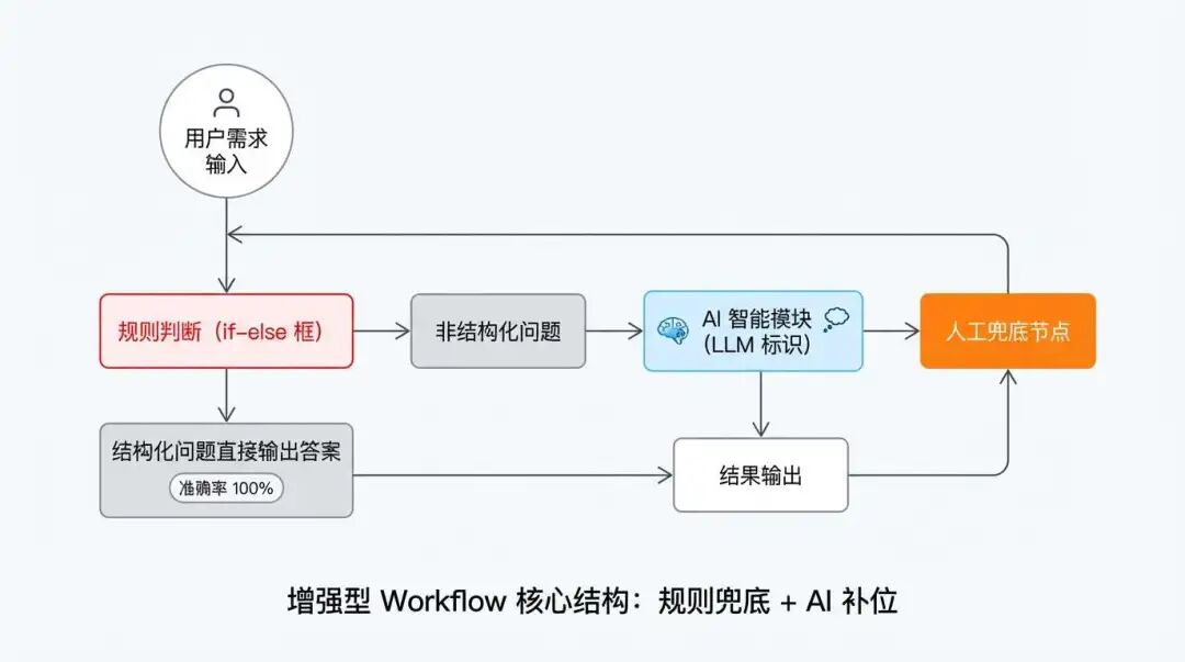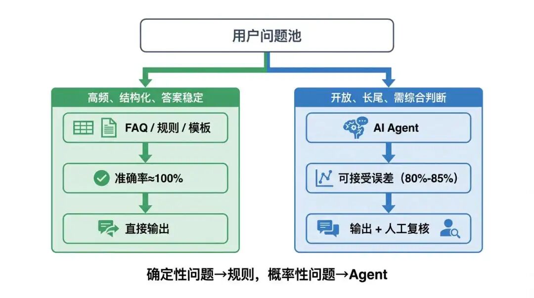 - 高频、结构化、答案稳定的问题:尽量用 FAQ、规则、模板,把准确率打到接近 100%