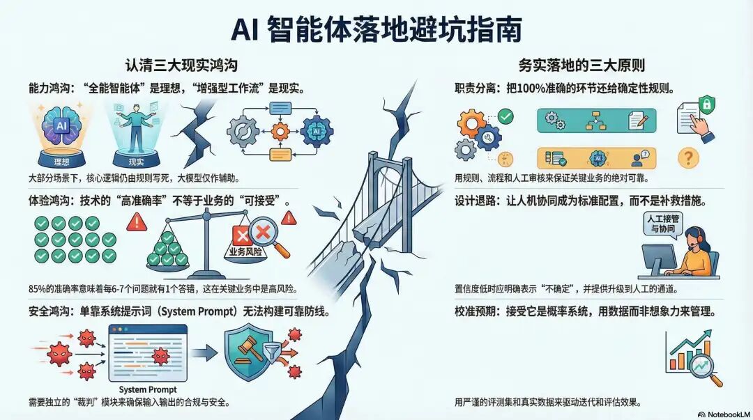 文章探讨了AI智能体落地的现实约束,指出多数"智能体"实为增强型工作流而非全能系统。作者强调需平衡智能与准确性,将问题分层处理,为Agent设计清晰"退路",接受其概率系统特性。安全方面应独立于主模型设置护栏。最终提出在可控工作流中让Agent适度发挥的务实原则,倡导AI Max/AI Min思维,区分需智能环节与仅需按规则执行的部分。