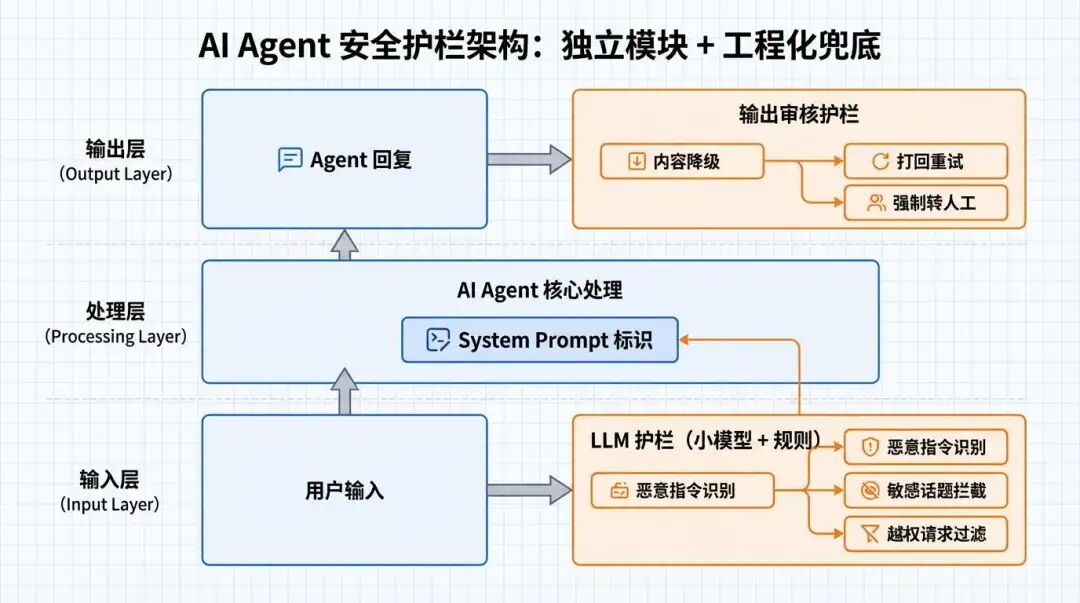 - 输出侧:对 Agent 的回复做二次审核,必要时做内容降级、打回重试或强制转人工