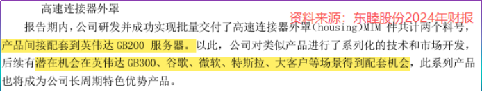 2024年,公司研发并批量交付了高速连接器外罩MIM件,产品间接配套英伟达GB200服务器,有望成为公司未来特色优势产品。