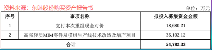 与此同时,东睦股份拟募集5.48亿元用于支付本次重组现金对价,另有3.61亿元用于高强轻质MIM零件及模组生产线技改和增产。