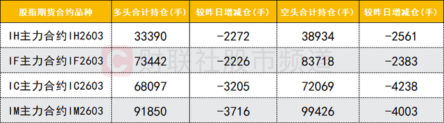 四大期指主力合约中,IH、IF、IC、IM合约多空双方均减仓,IC合约空头减仓数量较多。