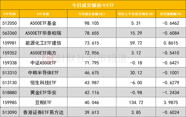 从成交额前十的ETF来看,A500ETF基金(512050)成交额位居首位,A500ETF华泰柏瑞(563360)成交额位居次席。