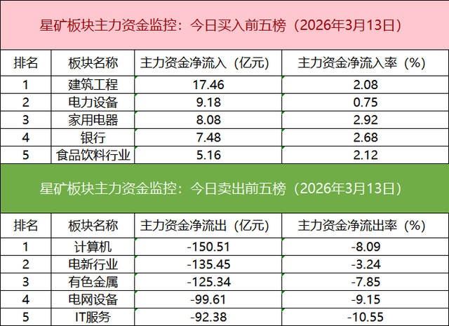 从主力板块资金监控数据来看,建筑工程板块主力资金净流入居首。