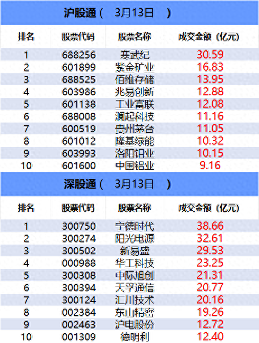 从沪股通前十大成交个股来看,寒武纪位居首位;紫金矿业和佰维存储分居二、三位。