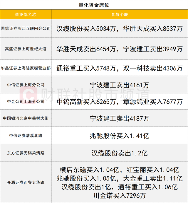 量化资金活跃度较高,川金诺获一家量化资金(开源证券西安太华路)买入0.72亿,红宝丽也获该席位买入1.04亿。