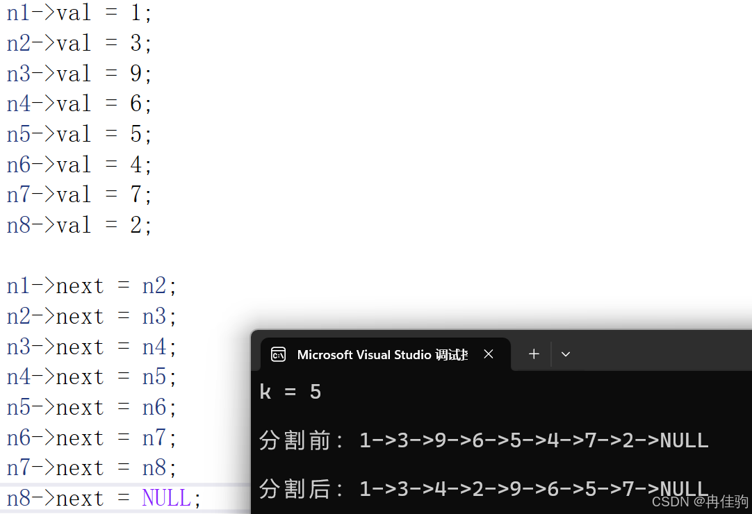 代码思路:创建两个带哨兵位的单链表,一个用来链接小于 x 的节点,一个用来链接大于等于 x 的节点,最后再把两个链表进行链接,这样就完成了链表的分割,并且没有改变原来的数据顺序