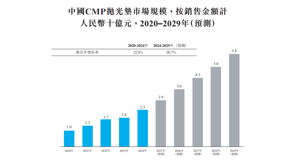CMP抛光垫是化学机械抛光(CMP)核心耗材,用于半导体晶圆制造,对硅片晶圆及表面薄膜如氧化硅等进行高精度平坦化处理。它与抛光液及抛光头协同,在一定压力和转速下,实现化学与机械协同去除,将晶圆表面微观形貌控制在纳米级,满足先进制程平坦度要求。受益于中国晶圆制造产能扩张和成熟制程芯片需求上升,2020–2024年国内CMP抛光垫市场规模快速增长,销售金额从人民币10.0亿元增至人民币23.0亿元,复合年增长率22.8%。未来,因先进制程芯片技术迭代使单晶圆抛光工序增加,预计到2029年,中国CMP抛光垫销售金额将达人民币58.0亿元,复合年增长率20.7%。