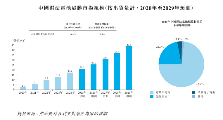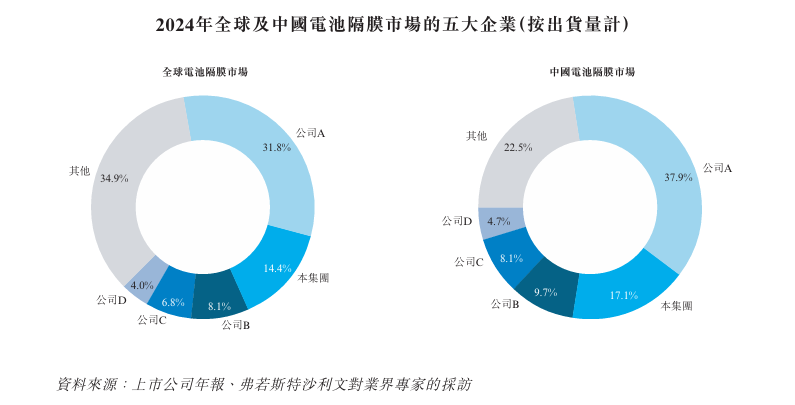 按出货量计,公司于2024年在干法隔膜市场的市场份额位居全球第一,而于湿法隔膜市场的市场份额按出货量计位居全球第二。