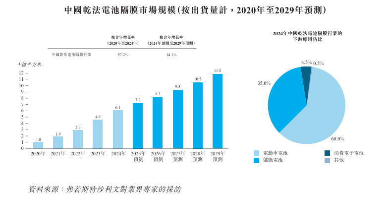 于2020年至2024年,中国干法电池隔膜的出货量由约10亿平方米增加至约61亿平方米,复合年增长率为57.2%。在下游行业进一步发展的带动下,中国干法电池隔膜的出货量预计到2029年将达到约118亿平方米,自2024年起复合年增长率为14.1%。