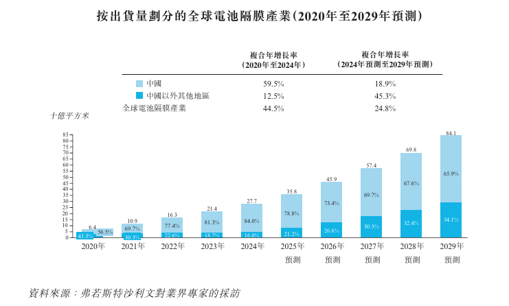 展望未来,在政府额外规定与技术进步的带动下,预计全球电池隔膜市场出货量规模将从2024年的277亿平方米增加至2029年的841亿平方米,复合年增长率为24.8%。
