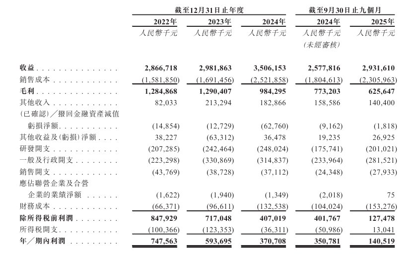 于2022年、2023年、2024年、2025年截至9月30日止九个月,公司录得年/期内利润分别约为7.48亿元、5.94亿元、3.71亿元、1.41亿元人民币。
