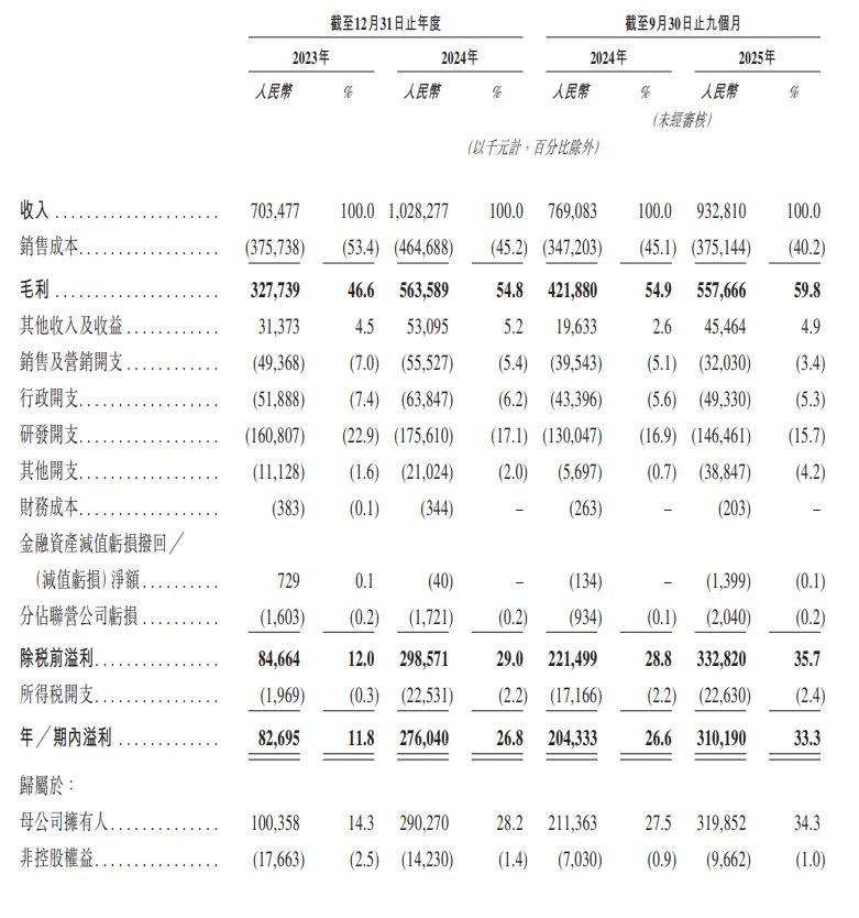 于2023年度、2024年度、2024年及2025年截至9月30日止九个月,公司实现年内/期内溢利分别为8269.5万元、约2.76亿元、约2.04亿元、约3.10亿元。