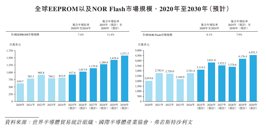 EEPROM和NOR Flash作为核心的非易失性存储芯片品类,前者以位元组级灵活擦除╱编程和高可靠性保障设备参数存储,后者以快速读取和芯片内执行(XIP)特性承载系统启动代码,两者均在汽车电子、人工智能和消费电子等关键应用中扮演着不可替代的角色。EEPROM芯片市场规模从2020年的约6.12亿美元增长至2024年的8.12亿美元,复合年增长率为7.4%。NOR Flash芯片市场规模从2020年的20.196亿美元增长至2024年的约27.61亿美元,复合年增长率为8.1%。未来随着非易失性存储芯片整体市场的稳定增长,EEPROM和NOR Flash芯片市场规模预计将于2030年分别增长至15.71亿美元以及45.52亿美元。