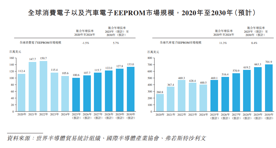 由于近年来全球消费电子销售规模的逐步放缓,消费电子EEPROM市场规模有所下降。汽车电子EEPROM受益于新能源汽车的爆发式增长,其EEPROM市场规模从2020年的约2.61亿美元快速增长至2024年的约4亿美元,复合年增长率为11.3%。未来随着下游应用需求的复苏与升级,消费电子EEPROM和汽车电子EEPROM市场规模预计将于2030年分别增长至1.33亿美元以及约7.02亿美元。