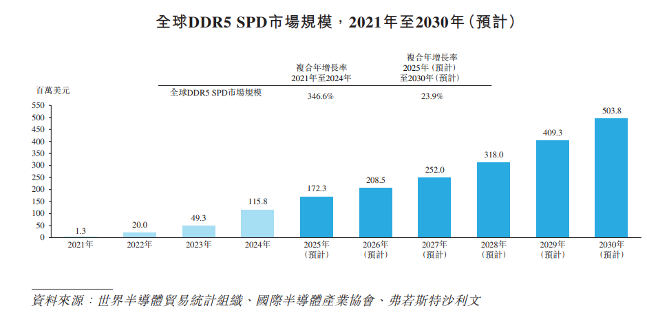 DDR5 SPD作为新一代存储器模组的核心配置芯片,以集成的串列存在检测功能和高精度温度传感器保障存储器系统的高速稳定通信,在数据中心、高性能计算及个人电脑等关键应用中扮演着不可替代的角色。全球DDR5 SPD芯片市场规模从2021年的130万美元激增至2024年的约1.16亿美元,完成了从商业化初期到规模化应用的跨越。未来随着DDR5存储器渗透率的持续提升以及存储技术的迭代,DDR5 SPD芯片市场规模预计将于2030年增长至约5.04亿美元,2025年至2030年的复合年增长率预计为23.9%。