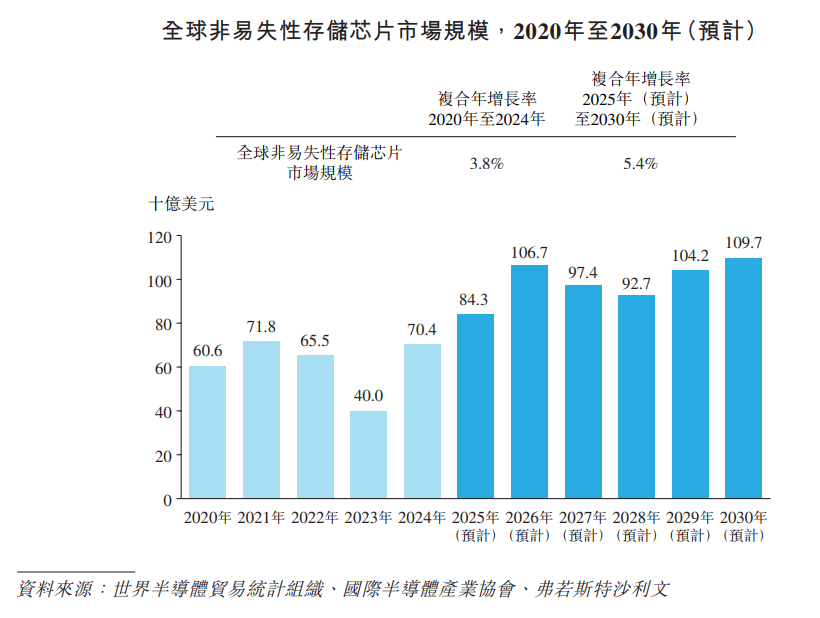招股书中提到,非易失性存储芯片作为在断电环境下仍可永久保存数据的核心硬件,已成为AI服务器、汽车电子、消费电子等关键产业发展的战略性基础元件与数据存储基石。全球非易失性存储芯片市场规模在2022年至2023年间,因全球产能过剩导致的价格下行,由655亿美元减少至400亿美元;随后于2024年市场快速回升至704亿美元,2020年至2024年期间复合年增长率为3.8%。未来随着AI服务器、AIPC、汽车电子及消费电子等下游市场的爆发式增长,预计全球非易失性存储芯片市场规模将于2030年达到1097亿美元。