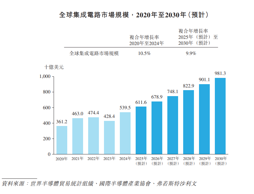 招股书中提到,集成电路是支撑人工智能、云计算及智能汽车等战略性新兴产业的核心载体与数据处理中枢。全球集成电路市场规模在2020年至2024年间呈现波动上升趋势,尽管期间受行业周期性供需调整影响,但整体规模仍由3612亿美元增长至5395亿美元,2020年至2024年的复合年增长率达10.5%。未来随着数字化转型的深入、高性能计算需求的爆发以及半导体技术的持续反复迭代,预计全球集成电路市场规模将于2030年达到9813亿美元,2025年至2030年的复合年增长率预计为9.9%。