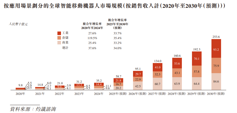 按销售收入计,全球智能移动机器人市场规模由2020年的人民币98亿元增至2024年的人民币352亿元,复合年增长率为37.6%,预期到2030年将达人民币2,536亿元,2025年至2030年的复合年增长率为34.0%。在中国,智能移动机器人市场规模由2020年的人民币22亿元增至2024年的人民币108亿元,复合年增长率为49.8%,预期到2030年将达人民币881亿元,2025年至2030年的复合年增长率为36.1%。