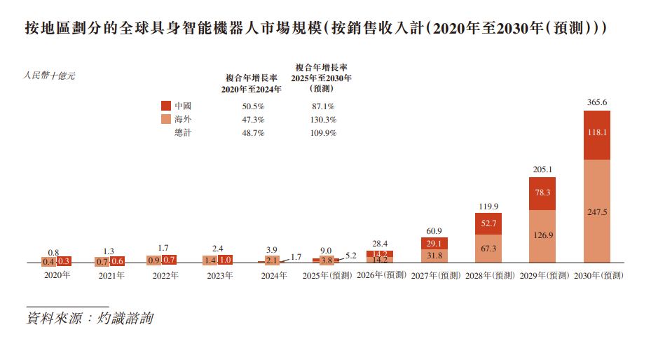 随着大型AI模型的不断发展和多样化数据集的日益累积,全球具身智能机器人市场正在快速增长。按销售收入计,全球具身智能机器人市场规模于2024年达人民币39亿元,预计到2030年将增至人民币3,656亿元,2025年至2030年的复合年增长率为109.9%。在中国,具身智能机器人市场规模于2024年达人民币18亿元,预计到2030年将增至人民币1,181亿元,2025年至2030年的复合年增长率为87.1%。