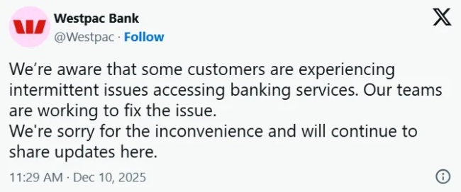 西太银行表示,正在努力尽快恢复服务,对给用户造成的不便表示歉意。
