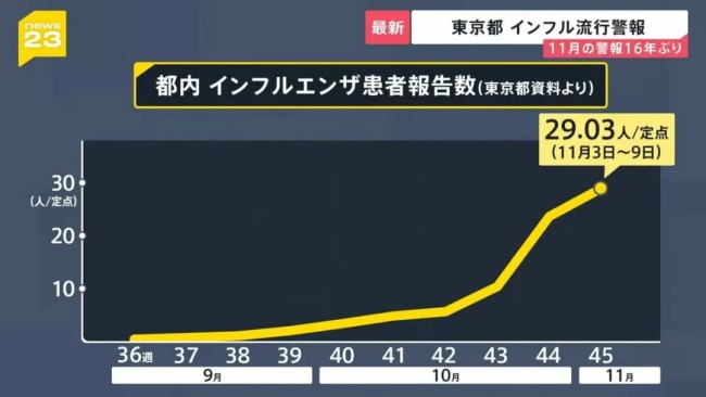 根据官方数据显示,截至11月9日的一周内,东京都定点医疗机构平均每家报告29.03例流感患者,较前一周急增约1.2倍,已突破“平均30例”的警戒线。疫情扩散速度远超预期,标志着今冬流感季提前6周到来。
