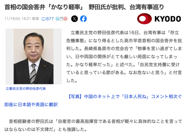 16日,日本立宪民主党总裁野田佳彦批评高市早苗在国会的回应。高市早苗在会议中表示,台湾的紧急状态可能构成“生存危机”。在长崎县岛原市举行的立宪民主党党代会上,野田佳彦表示:“她做得太过分了,使日中关系陷入非常紧张的境地。这相当鲁莽。”