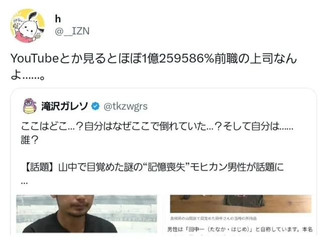 今年7月10日左右,日本国道314号沿线,突然出现了一名顶着莫西干发型的“神秘”男子。据这名男子自己说,突然在国道附近的草丛里醒来,感觉剧烈头痛,然后就是经典的失忆桥段,完全不记得自己是谁。
