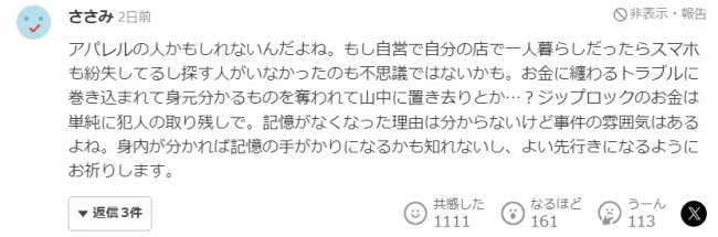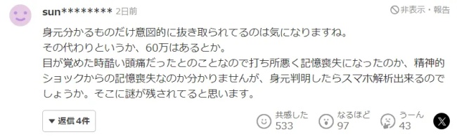 身份信息相关的物品被刻意拿走这一点,让人十分在意。 取而代之的是,现场还留下了高达60万日元的现金,这显得很不寻常。 据说他醒来时有非常剧烈的头痛,因此目前尚不清楚他的失忆是由于头部受到重击、位置不巧导致的脑损伤,还是源于强烈精神冲击所引发的心理性失忆。 如果确认了身份,应该就可以对手机进行技术解析吧。但即便如此,事件背后的诸多谜团仍然没有解开,总觉得还有很多谜悬而未决。
