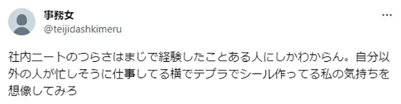 「只有亲身经历过的人,才能体会当公司尼特族有多么痛苦。看着大家忙得团团转,而自己却只能在一旁无聊地剪贴纸,你能想象我的心情吗?」