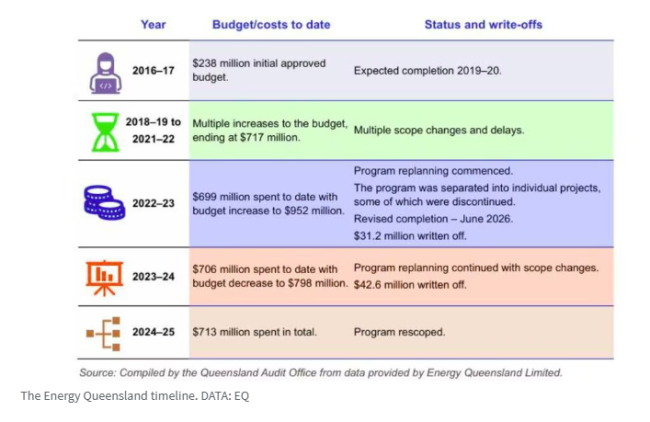 最令人头疼的问题源于Energy Queensland自2016年启动的大规模数字化转型计划,该项目屡次延迟、不断调整并缩减规模。昆州审计署的审查报告称,Energy Queensland仍深陷这场庞大的技术改革泥潭。