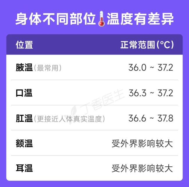 ● 水银体温计和电子体温计测量的部位不一样,而身体不同部位的温度,本身也不一样。不同部位的正常体温范围可参考👇
