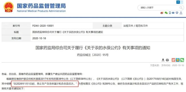 事实上,这并不是一个突然的决定,早在 2020 年,国家药监局就发布了《国家药监局综合司关于履行〈关于汞的水俣公约〉有关事项的通知》。