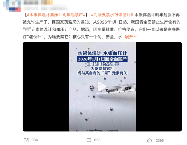 近日,一则关于「水银体温计血压计明年起禁产」的消息冲上热搜,引发热议。