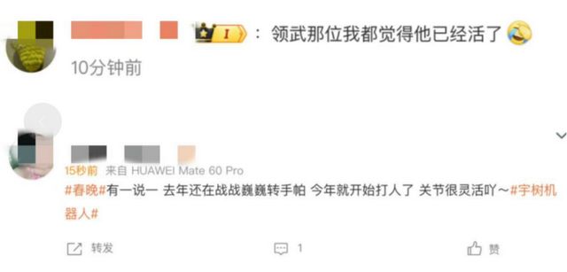 春晚当晚,#机器人全面入侵春晚#登上微博热搜第二。特别是看过宇树机器人的武术表演后,有人直言“领武那位我都觉得他已经活了”;还有人感叹“去年还战战巍巍转手帕,今年就开始打人了”;更有人示爱,“我宣布,我爱上机器人了”。