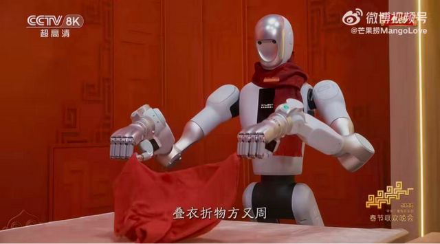这一晚,我们看到了不一样的机器人,它们在不同的场景里出现,家庭、演出现场、零售店,它们能哭能笑,会洗衣服,能提供情绪价值;能唱能演,会叠衣服、卖烤肠,甚至还有一群会武术的。