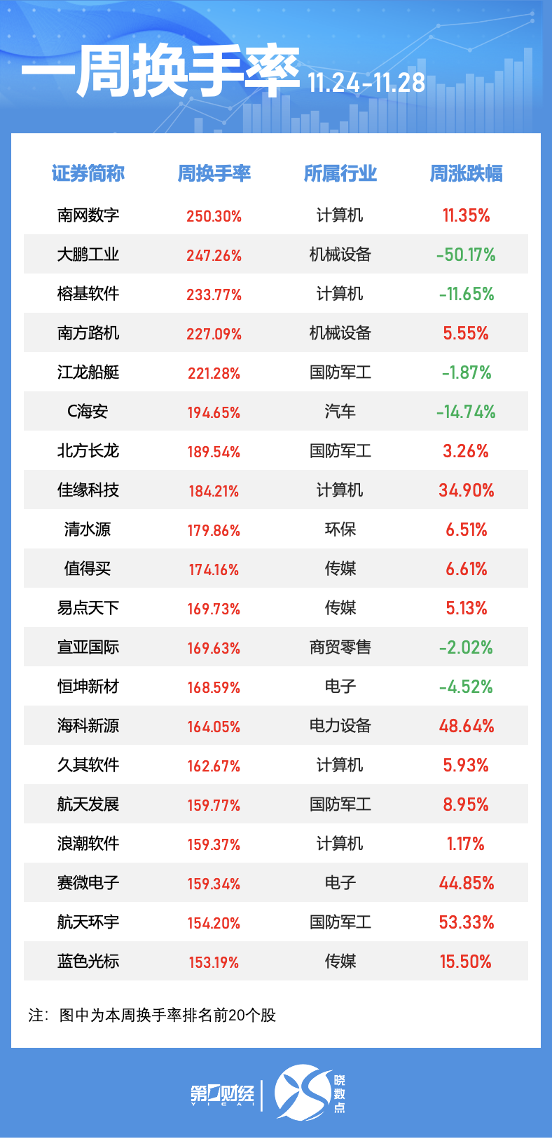 本周五个交易日中有64只个股换手率超过100%。其中,南网数字排名居首,周换手率达到250.30%;此外,大鹏工业、榕基软件、南方路机等4股本周换手率均超200%。