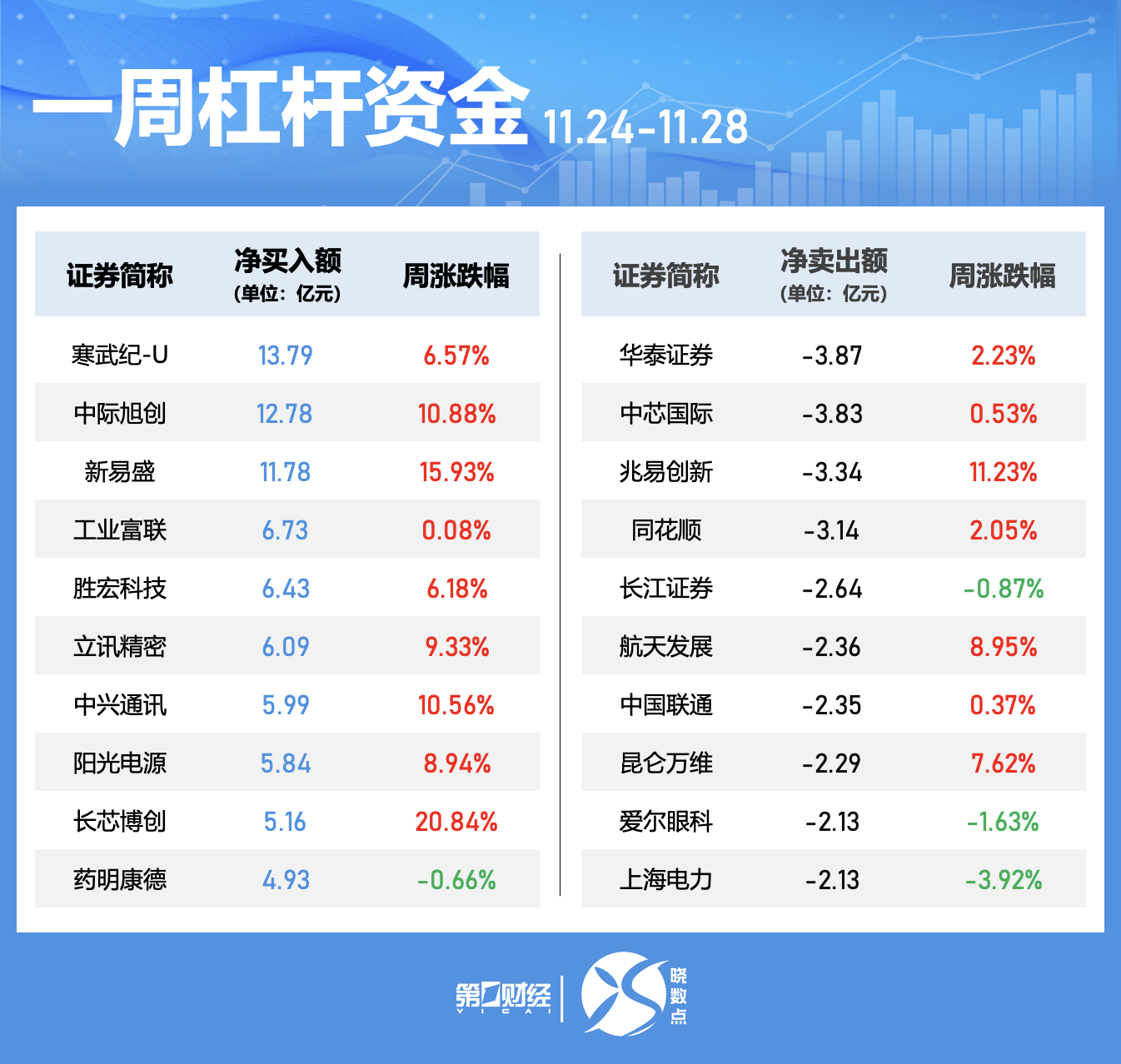 寒武纪-U本周获融资净买入居首,净买入额为13.79亿元。中际旭创、新易盛、工业富联净买入额居前,金额分别为12.78亿元、11.78亿元、6.73亿元;华泰证券、中芯国际、兆易创新遭净卖出额居前,金额均超3亿元。