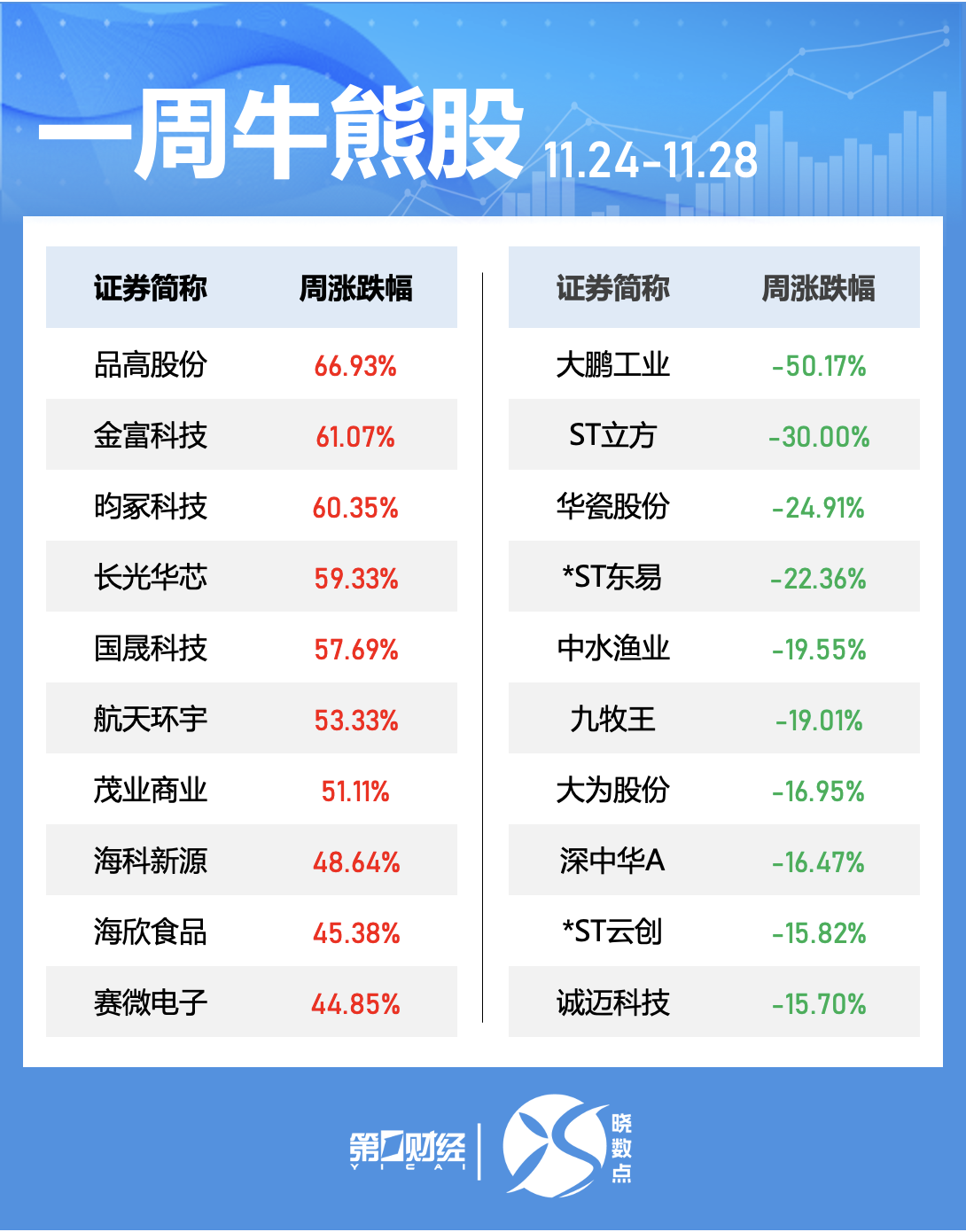 跌幅榜中,本周累计下跌的个股中,30股累计跌幅在10%以上。大鹏工业跌幅居首,本周累计跌超50%,此外,ST立方累计跌幅达30%。