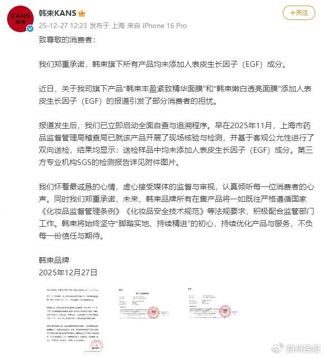 两款面膜被央视曝光涉嫌“非法添加”表皮生长因子,12月27日,韩束回应:旗下所有产品均未添加人表皮生长因子成分。已立即启动全面自查与追溯程序。