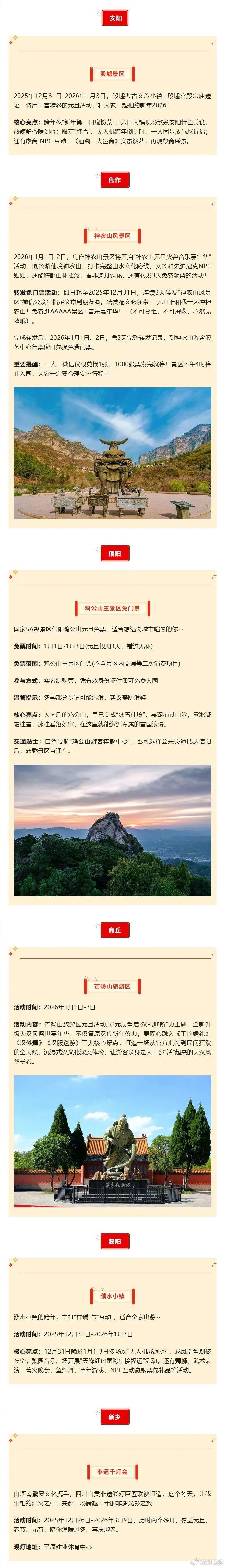 近期河南有多家景区免票、半价,部分元旦期间也享优惠:焦作云台山12月1日~次年2月28日门票半价60元(需另购60元车票,3天有效);南阳五朵山即日起~12月31日免门票(需购5元意外险);鸡公山主景区2026年1月1日~3日免门票;丹江大观苑即日起~12月31日对多地区游客免门票(需购2元保险);河南老界岭即日起~12月31日对全国游客免门票;平顶山尧山风景区即日起~12月31日(法定节假日除外)特定姓氏游客免门票(可携亲属,需购5元保险)。