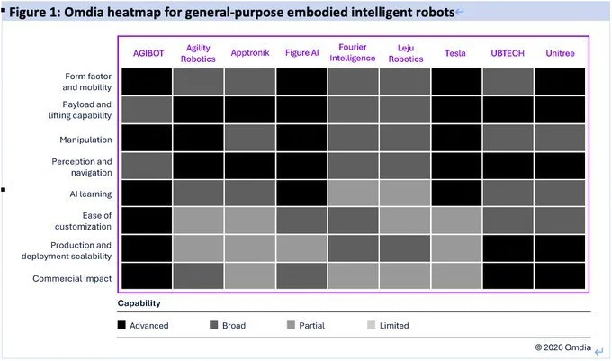 Omdia利用其基于热力图的评估模型,从八个维度对全球领先企业进行了评估,包括形态与移动性、负载与起重能力、操作能力、感知与导航、AI学习能力、定制易用性、生产与部署扩展性以及商业影响力。智元机器人在其中六个评估维度中获得了最高评级——“领先”(Advanced),是本次评估中获得顶尖评级数量最多的公司。